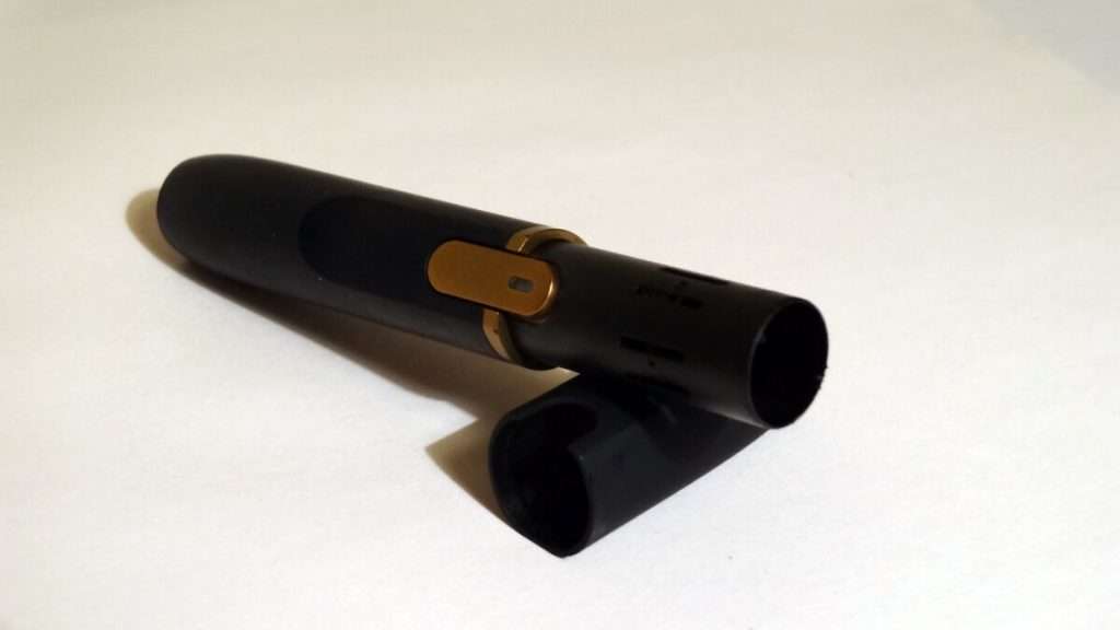 A button hidden in the case opens the lid and gives access to the device itself. The “system” looks like a fountain pen the size of a lighter. Neat, I would even say an elegant device. The large button in the center of the case is the cartridge activation button, it is pressed once before starting smoking, when the cartridge is already inserted into the system.