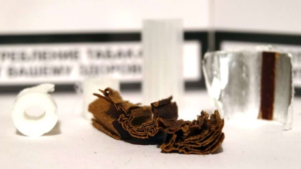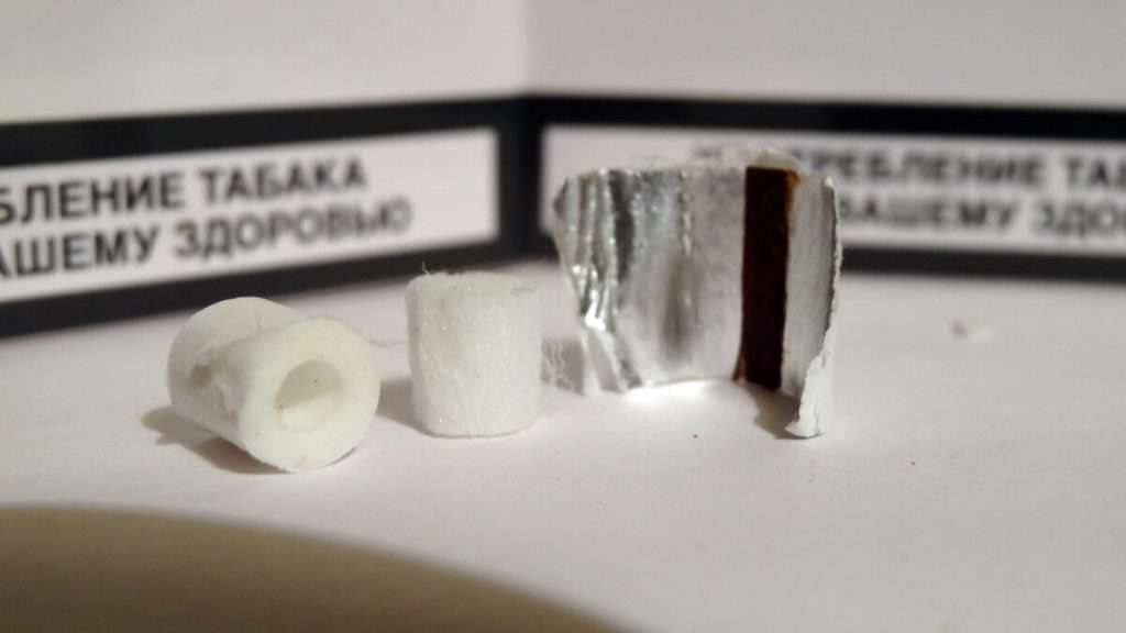 A large part of the filter is taken up by a dense “accordion” of fine polystyrene, called “biopolymer mass” by the manufacturer. The purpose of this part is quite clear — it gives overall stiffness to the stick’s construction. Moreover, after smoking it sintered, partially melting, so it can’t be used again. A stick is not a cigarette, you can’t butt it out))