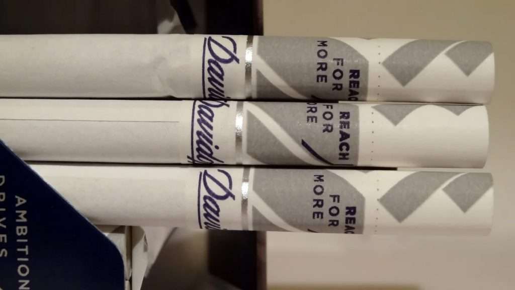 The design of the filter is modular, familiar from many other brands. The Davidoff Reach filter has three sections — of acetate fiber, exactly the same size of fiber with a sparse saturation of charcoal chips and a dense acetate mouthpiece. Tar characteristics of the cigarettes are not listed anywhere, but the “blue” range in the design and the single ring of perforation on the filter suggests to me that the Reach is a “light” cigarette.